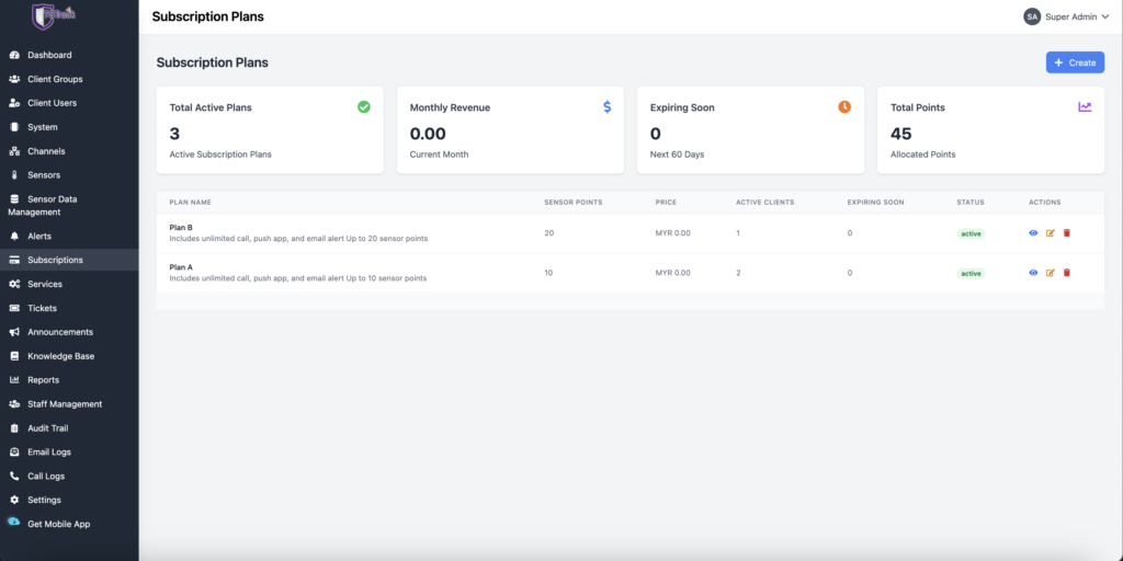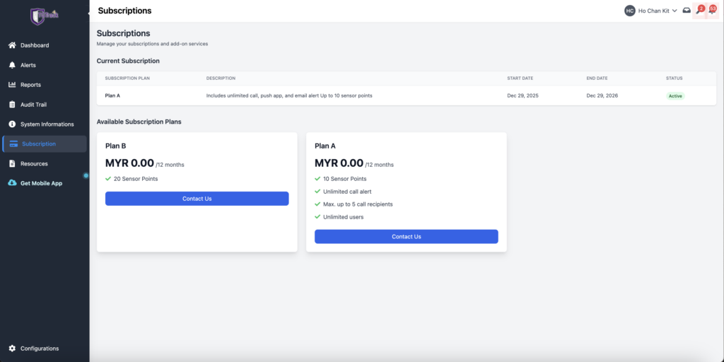 Supports flexible subscription packages based on sensor usage, including billing management, renewal reminders, and usage tracking.