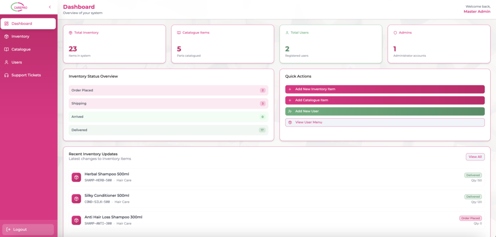 The Inventory Management System is a cloud-based solution designed to help businesses efficiently manage product inventory, catalogue information, stock movements, and internal support requests. With a clean and modern interface, the system simplifies inventory tracking while improving operational efficiency and visibility across departments.