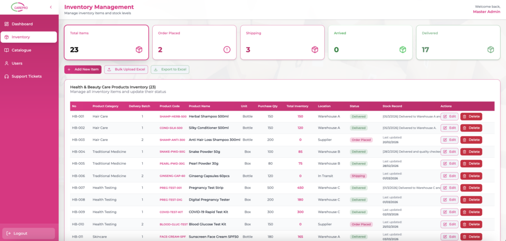 Easily manage inventory items including product category, product code, batch numbers, quantity, and warehouse location. Administrators can update item status, edit product information, or remove records when necessary.