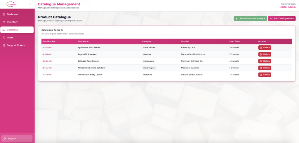 The system includes a catalogue management module where product specifications, categories, suppliers, and lead times can be organized and maintained. This provides a structured reference for all inventory items.