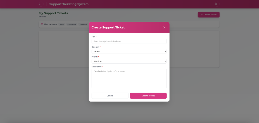 Administrators can track ticket status including Open, In Progress, Escalated, Resolved, or Closed.