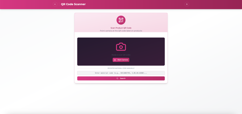 The QR code scanner allows users to scan product labels using a device camera. Once scanned, the system instantly retrieves product details for quick verification and inventory lookup.
